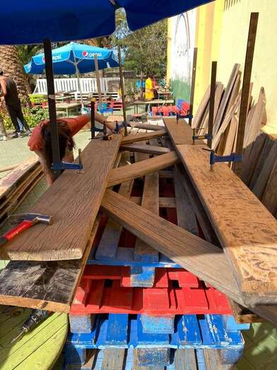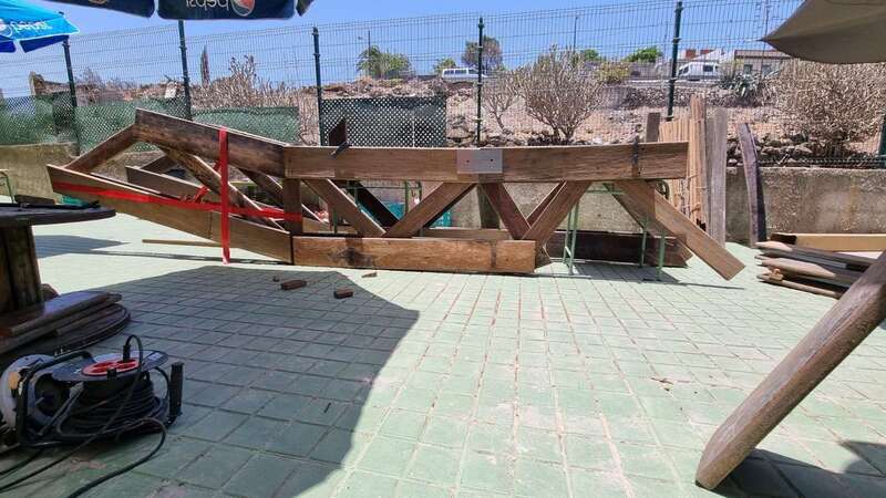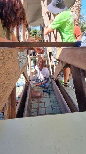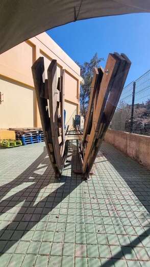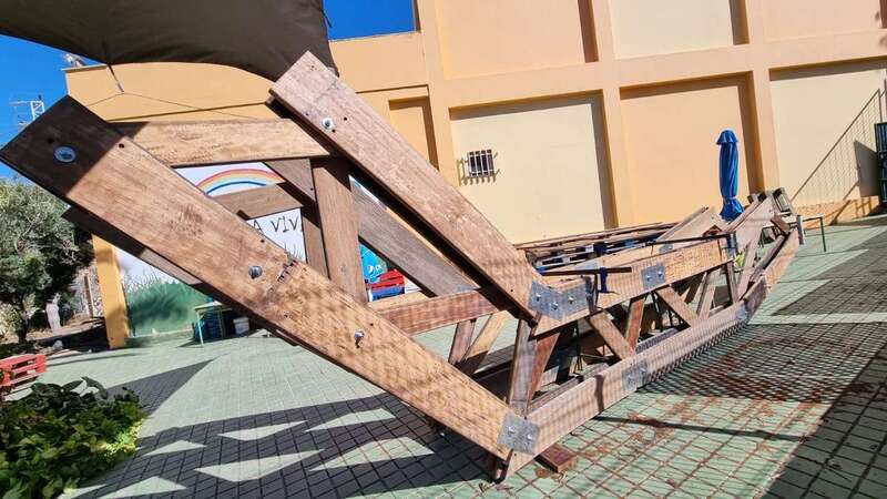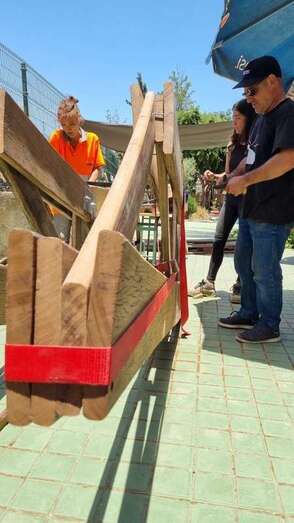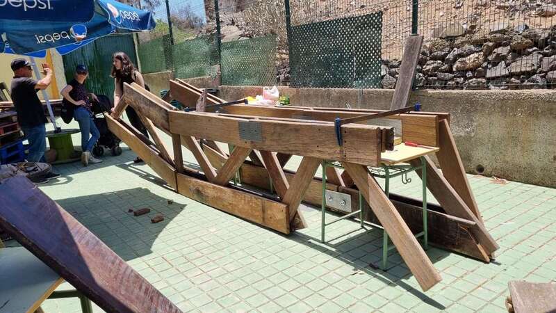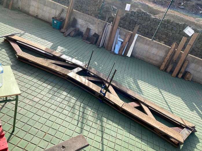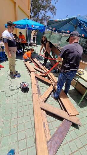El pasado 7 de junio comenzaron los talleres con el propio alumnado del instituto, con el objetivo del montaje de dos cerchas de madera de casi cinco metros de largo, el ajuste de canastas y la preparación de la pared donde irá enganchada la cubierta.