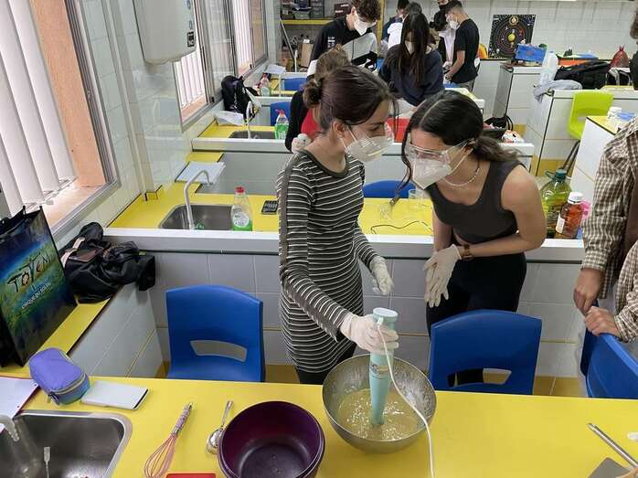 En cuanto al proyecto de la elaboración de jabones, esta actividad se ha desarrolló en la clase de Química de 1º de Bachillerato con el objetivo didáctico de observar la reacción de saponificación de los lípidos, en un trabajo en equipo; reciclar aceite de cocina usado para fabricar estos artículos, que también son respetuosos con el Medio Ambiente al no tener plásticos, tensoactivos o surfactantes; fomentar el cuidado de la piel con productos libres de conservantes y aditivos perjudiciales para la salud; e impulsar una acción solidaria con impacto directo en la sociedad palmera, afectada por la erupción volcánica.