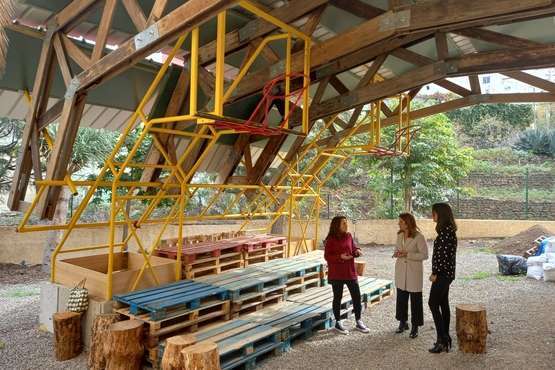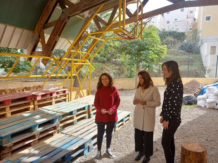 La directora del centro educativo, María Luisa Santana, y la profesora de Artes Plásticas, Raquel Santana, explicaron a la regidora el proceso de construcción y los materiales que han utilizado para levantar esta estructura que aún está en construcción.