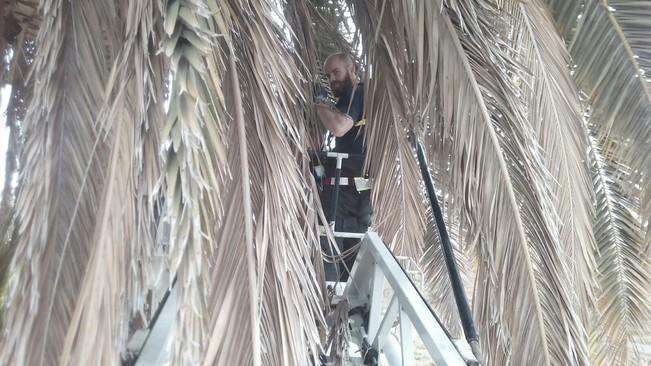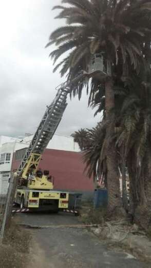 Efectivos del parque zonal de bomberos de La Garita repusieron a su nido, localizado a 10 metros de altura en una palmera de La Barranquera, a una cría de cernícalo que se cayó al suelo poco después del mediodía de este miércoles. El personal del Consorcio de Emergencias utilizó un camión escalera para devolver al animal a su hogar, donde le esperaban tres crías mas. TA ofrece imágenes.