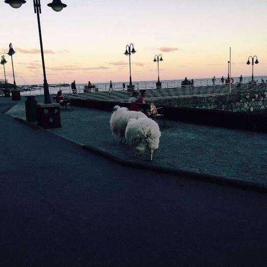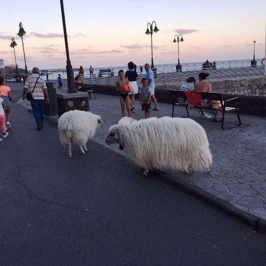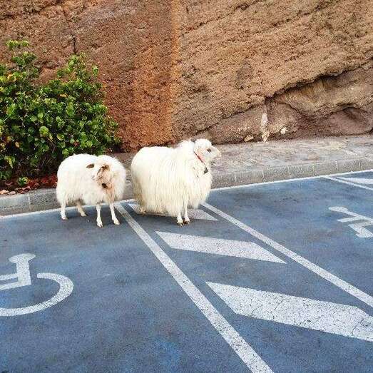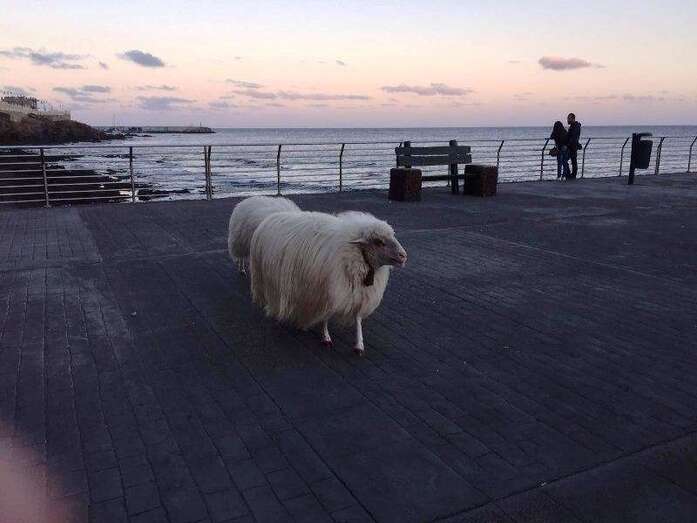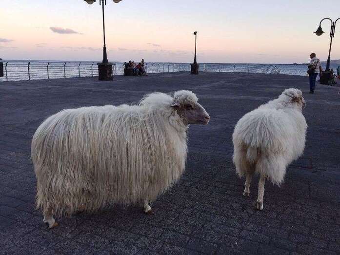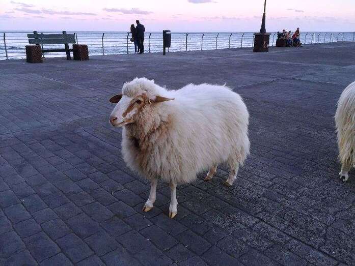 Las dos ovejas hermanas en la avenida y muelle de Melenara (Foto TA)