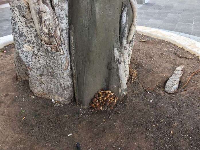 Hongos en la base de uno de los laureles de India de la plaza de San Juan (Foto TA)
