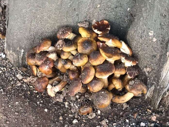 Con las primeras lluvias invernales han vuelto a florecer hongos en la base del laurel de Indias de la plaza de San Juan más próximo a la torre norte de la Basílica de Telde, árbol que padece una agonía lenta e irreversible desde hace años.