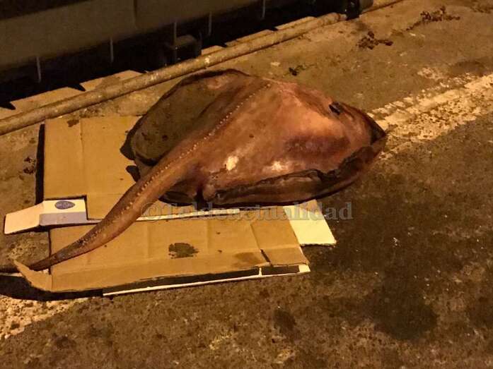 La imagen fue captada anoche después de las 22.00 horas. Una raya muerta fue depositada en los alrededores de un punto de contenedores de recogida de residuos en la playa de Ojos de Garza, una muestra más del incivismo galopante que se da en este municipio.