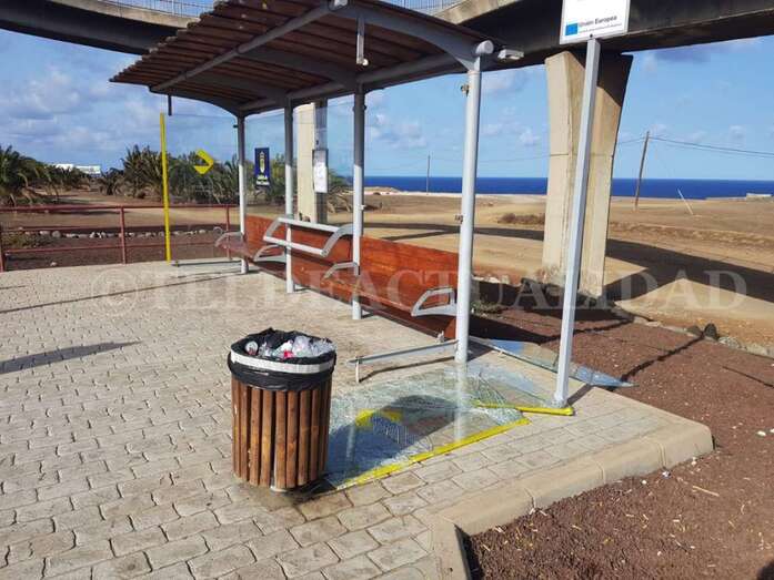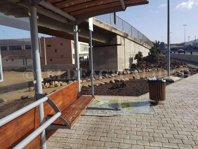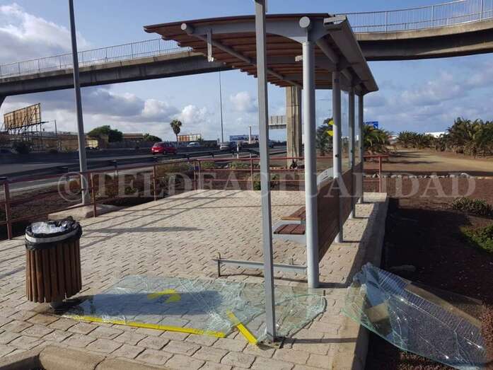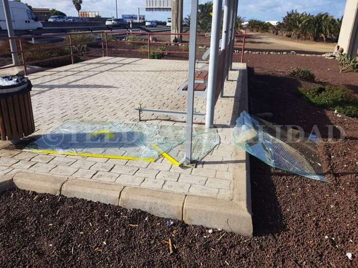 La marquesina que resguarda a los viajeros en la parada de guaguas de la GC-1 a la altura de La Estrella ha sufrido en los últimos días el ataque de los vándalos. Dos de los cristales han sido fracturados y yacen rotos junto a la estructura.