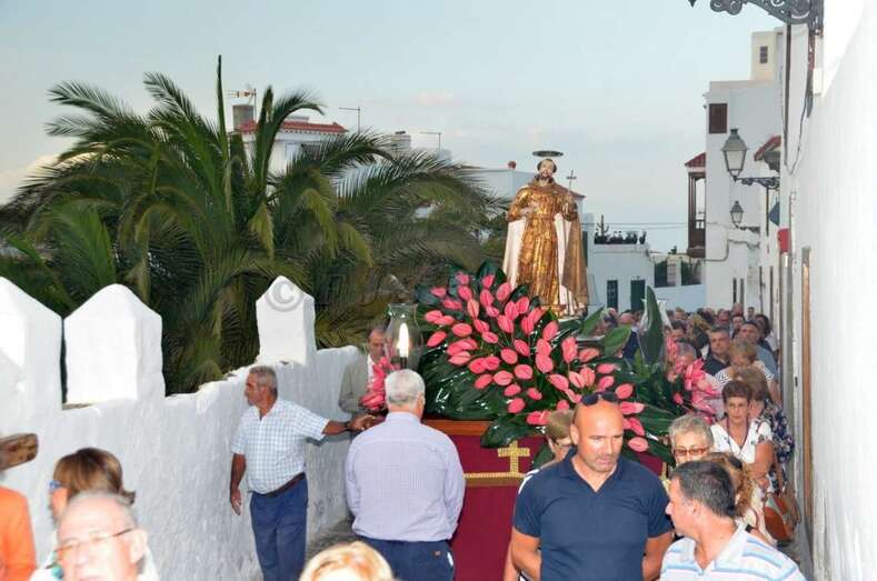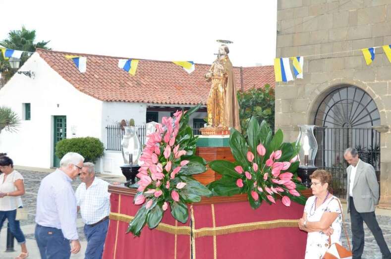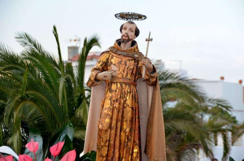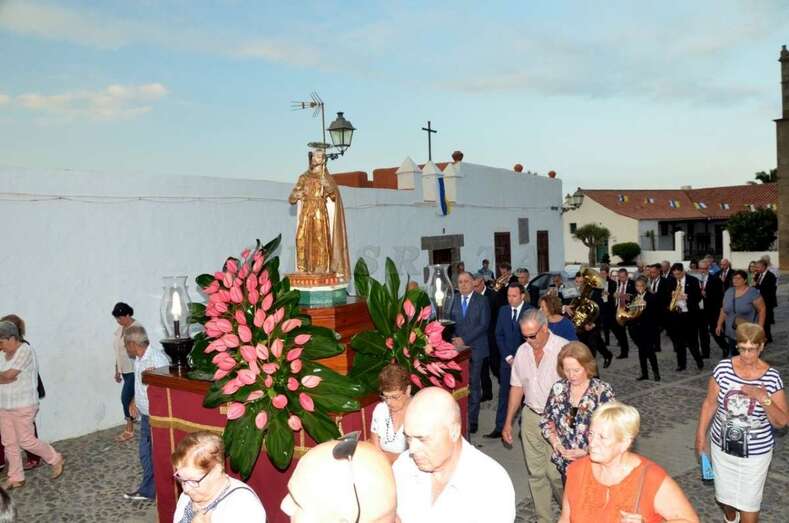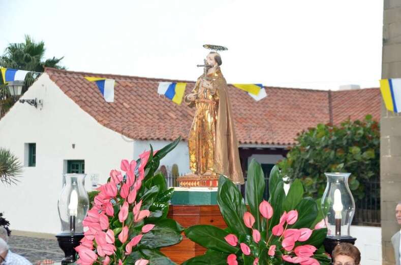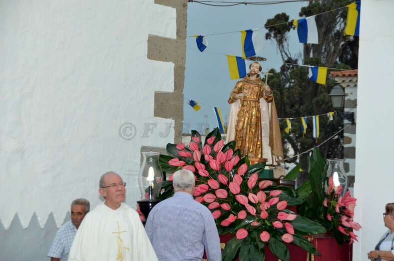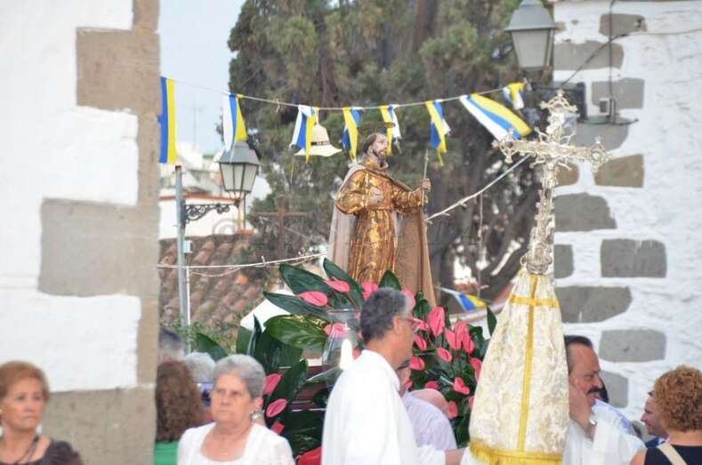 Un nutrido grupo de vecinos acompañó esta tarde al trono de San Francisco Asís en su procesión por las calles del entorno conventual de Telde que toma su nombre. El desfile por las empedradas vías, acompañado por la Banda de Música, tuvo lugar después de la misa oficiada por el párroco José María Cabrera.