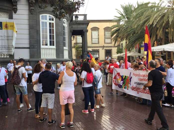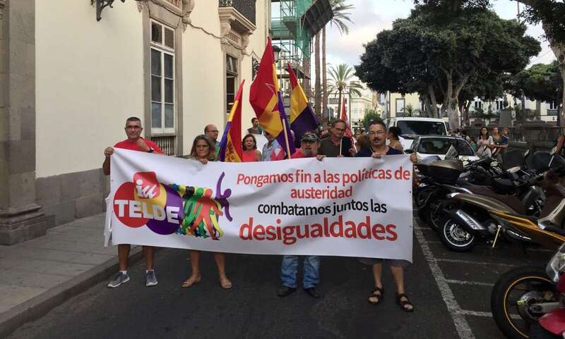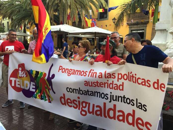 Miembros de Izquierda Unida Canaria en Telde y de la Red de Solidaridad Popular de Jinámar acudieron esta tarde a la capital grancanaria para visibilidad su rechazo a la pobreza y desigualdades en una manifestación que partió desde la Plaza de Las Ranas.