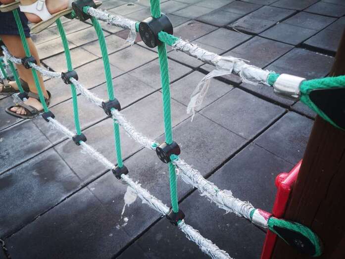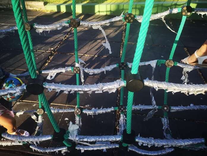 El deplorable estado en el que se encuentran las zonas infantiles de Telde alcanza límites insospechados. En el parque urbano de Arnao ha tenido que remendendar la red de uno de los juegos con cinta americana para que los menores puedan seguir trepando por ella.