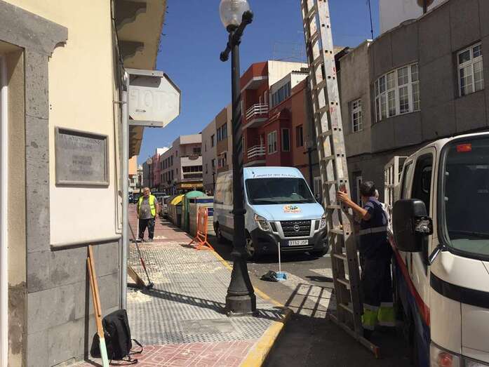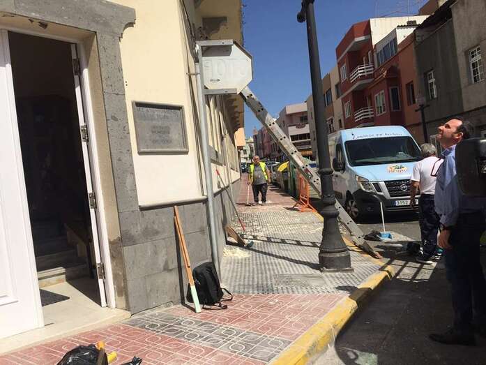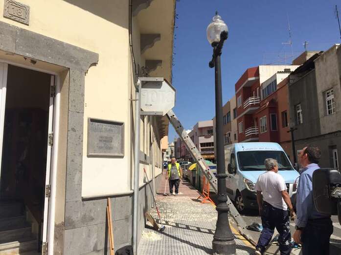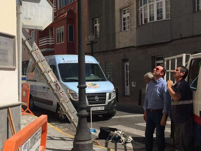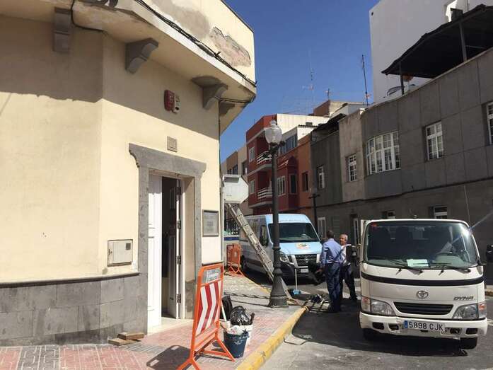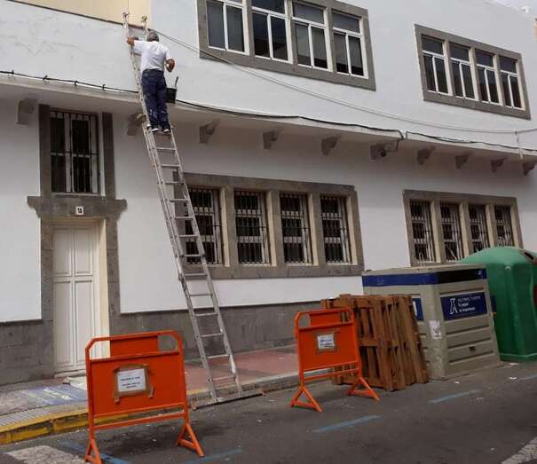 La fachada del inmueble de la Concejalía de Educación, en la esquina de la calle de Secretario Guedes Alemán con Andrés Manjón, está siendo reparada ante los continjuos desprendimientos de sus voladizos. CS ha criticado la falta de medidas de seguridad en los trabajos.