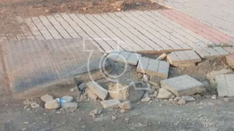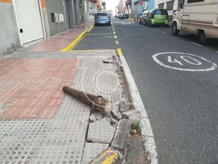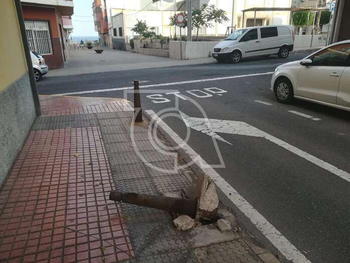 Destrozos en la acera de una calle por la caída de un bolardo (Foto TA) Destrozos en la acera de una calle por la caída de un bolardo (Foto TA)