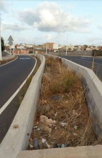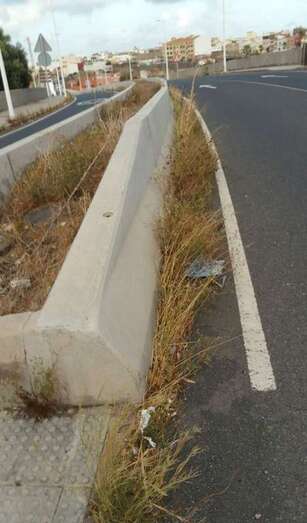 Losetas levantadas en las aceras, basuras en prácticamente cualquier rincón,  hierbas que crecen sin control en los arcenes y falta de iluminación. Esta es la estampa que presenta el inacabado viaducto de San José de Las Longueras, al que además de faltarle un carril también va echando en falta ya un lavado de cara.