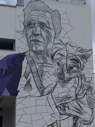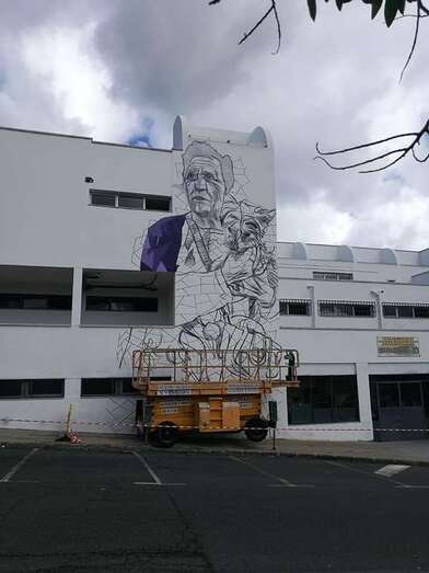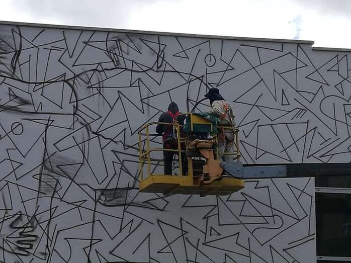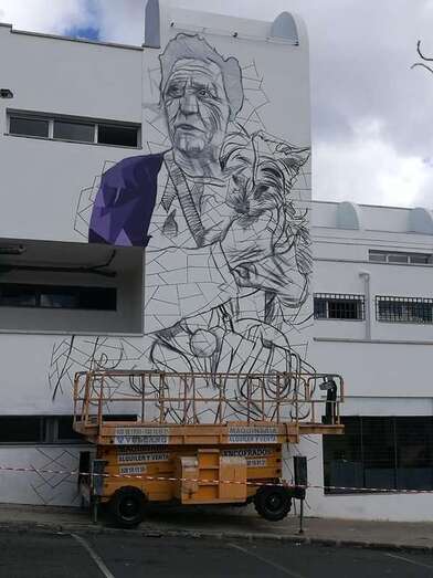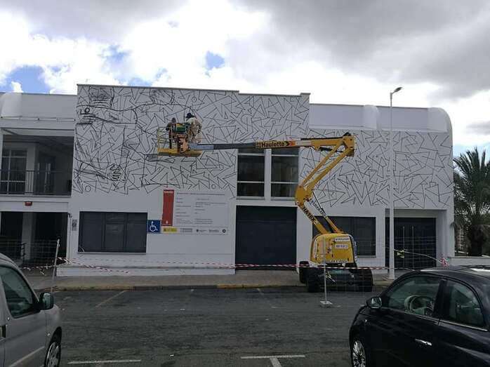 Sabotaje al Montaje ya ha comenzado a dar forma a los murales que decorarán la fachada de la Gerencia de Jinámar. Unos dibujos que reflejan el entorno costero y urbano del Valle y con los que se quiere sensibilizar a la población sobre el empoderamiento cívico.