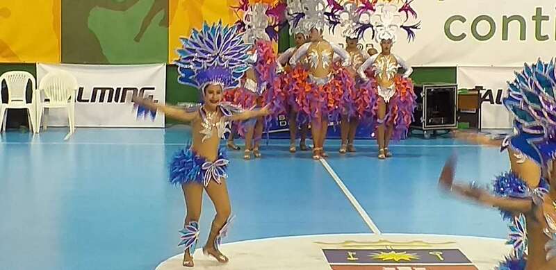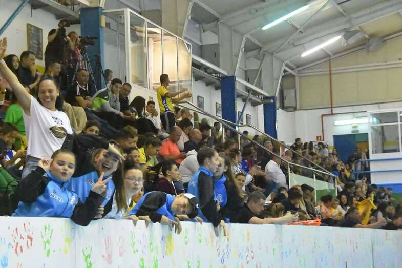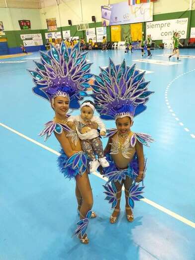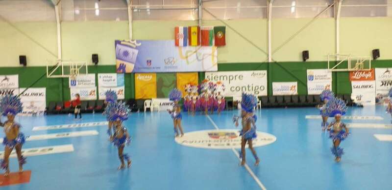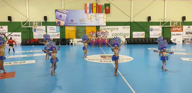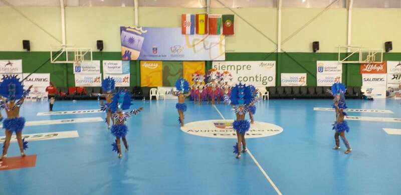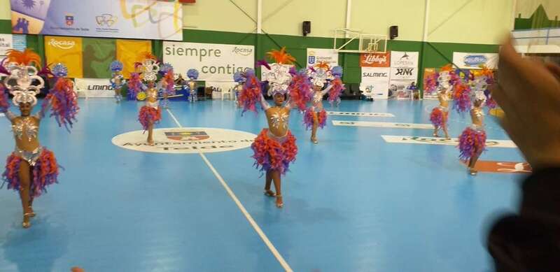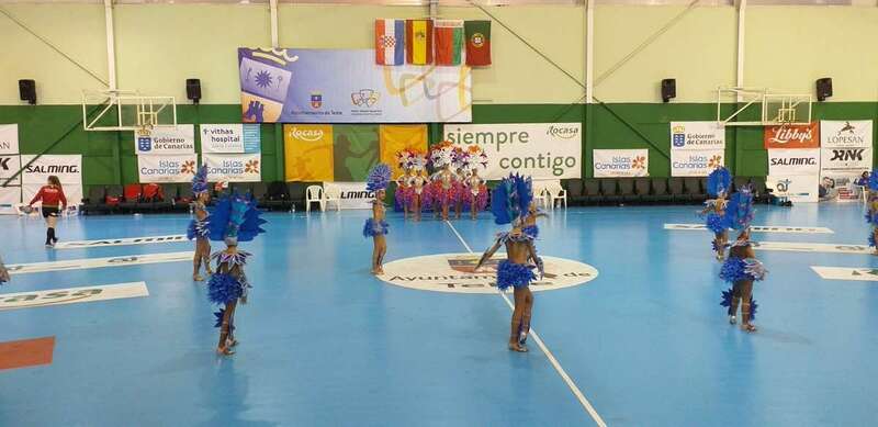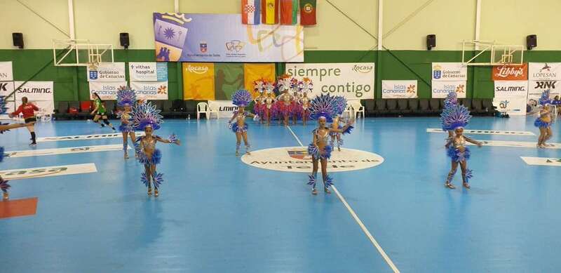 La comparsa Los Diamantes actuó este sábado en el descanso del partido de ida de cuartos de final de la Challenge Cup que Rocasa y Gomel disputaron en el Pabellón Insular Antonio Moreno de Las Remudas.