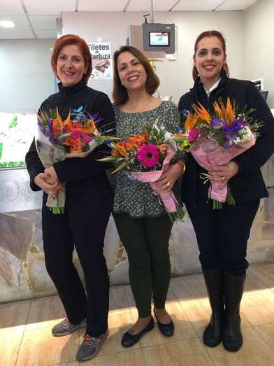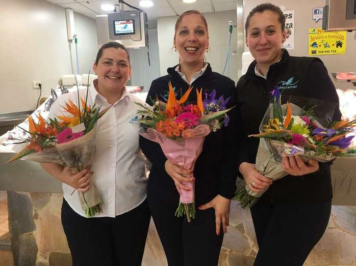 La empresa Pescadería Mercamar, de Telde, obsequió este viernes, Día de la Mujer Trabajadora, con un ramo de flores a su personal del negocio de la calle de Alférez José Ascanio, constituido únicamente por féminas.