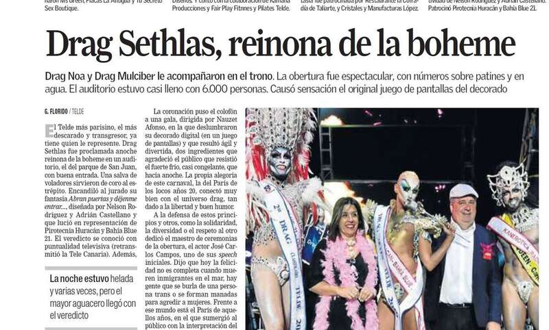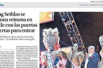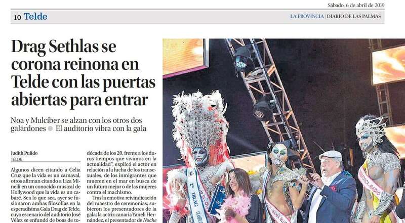 La espectacularidad de la Gala Drag Queen de Telde, que tuvo lugar anoche en el Auditorio José Vélez, es elogiada en la edición de este sábado por la prensa regional. Tanto C7 como LP dedican dos amplias páginas al evento que coronó a Drag Sethlas como nueva reinona del Carnaval.