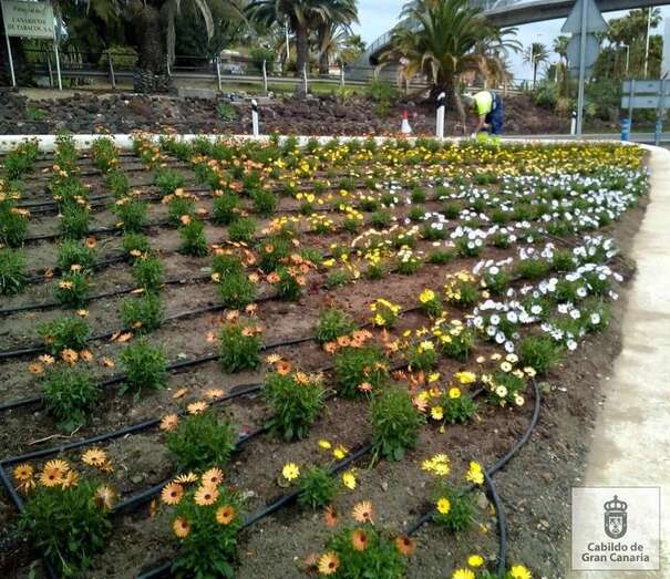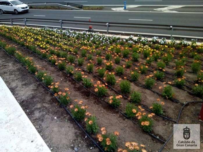 El Servicio de Mantenimiento de Carreteras del Cabildo realiza estos días trabajos de plantación y riego en la autovía GC-1, en el tramo de acceso a Telde y La Garita.