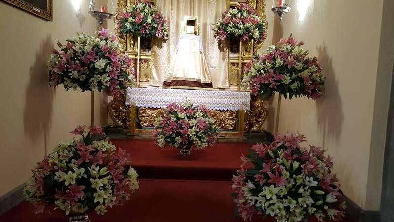 Un vistoso ornato floral embellece la capilla del Santísimo de la iglesia de La Concepción de Jinámar, obra del diseñador Segundo Amador, con motivo de la Semana Santa. El conocido como Monumento se compone de ocho ramos de lirios rosas y blancos.