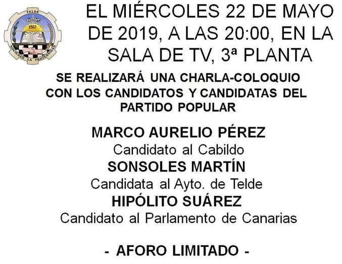 Los candidatos del Partido Popular a la Alcaldía de Telde, al Cabildo de Gran Canaria y al Parlamento por la lista regional, Sonsoles Martín, Marco Aurelio Pérez e Hipólito Suárez, ofrecerán este miércoles (20.00 horas) una charla-coloquio en la Sociedad La Fraternidad, en Los Llanos.