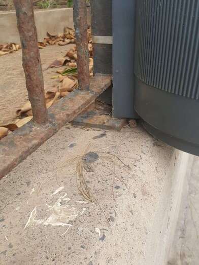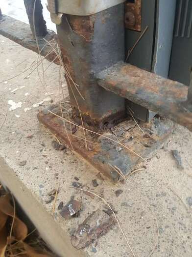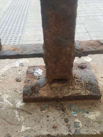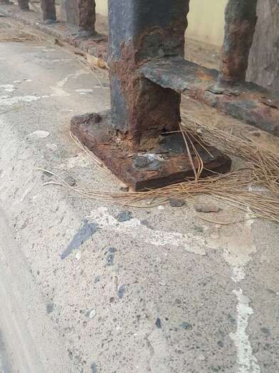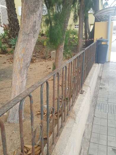 Una valla metálica de la Avenida de la Paz (Las Remudas) amenaza con caerse debido al estado herrumbroso de sus anclajes al muro perimetral de los jardines. Está sujeta a un árbol, a la altura de calle de Alejo Carpentier, para evitar su desprendimiento.