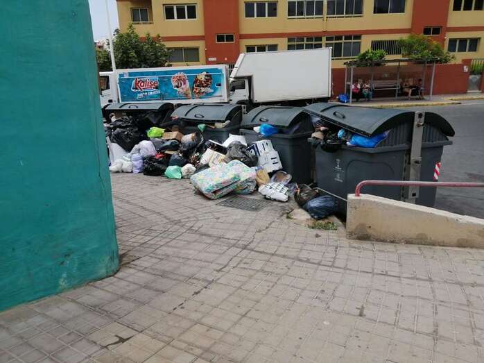 Penosa imagen la que se volvió a dar este jueves festivo en Melenara. La acumulación de residuos y bolsas de basura fuera de los contenedores situados en el acceso principal a esta popular playa teldense -donde ondea la Bandera Azul,, en un día de gran concurrencia de usuarios.