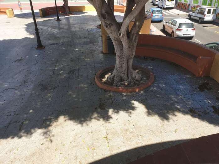 Vecinos de Marpequeña se quejan del pésimo estado en que se halla la plaza pública, donde abundan los excrementos de palomas, orines en el escenario, baldosas levantadas, etcétera.