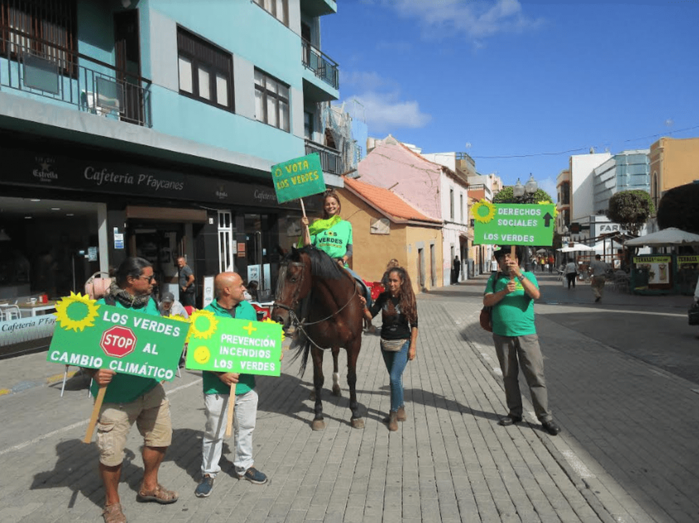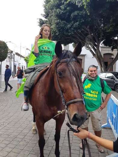 El caballo Ero se sumó este jueves a la campaña electoral de Los Verdes en Telde. La candidata Nereida López al Congreso de Diputados recorrió esta mañana el sector de Los Llanos a lomo del equino llamando la atención de los transeúntes que paseaban por la zona comercial abierta de Los Llanos. En 2015, Sebastián Henriquez, de RdG, hizo lo propio.