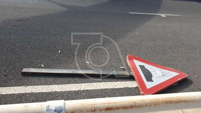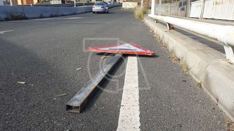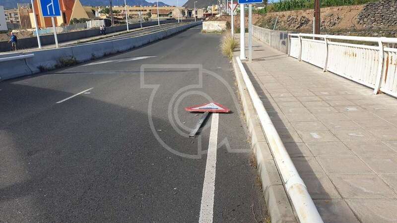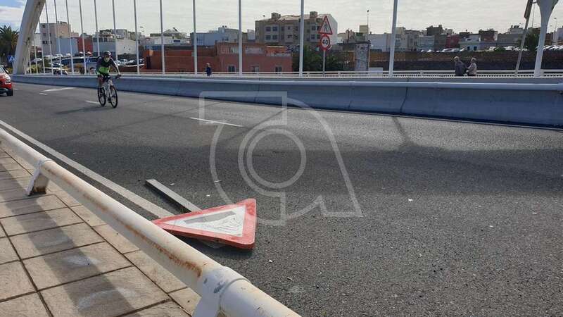 Tres semanas sostienen los vecinos que lleva esta señal de tráfico tirada sobre el asfalto de un carril del viaducto sobre el Barranco de los Ríos en dirección hacia Las Longueras. Sorprende que ningún servicio municipal, incluida la Policía Local, se haya dado cuenta de su existencia.