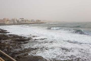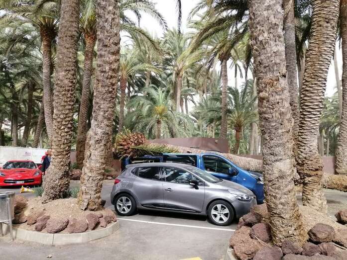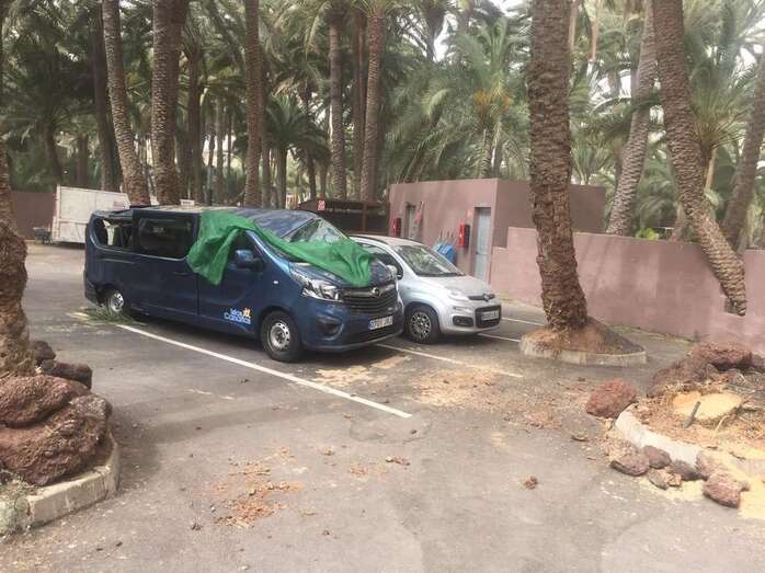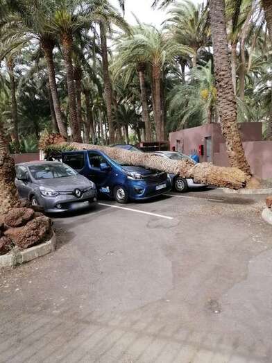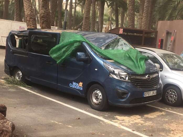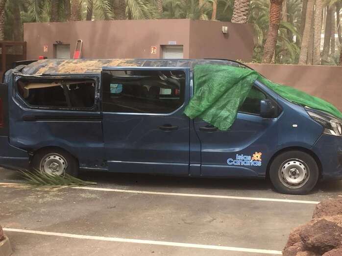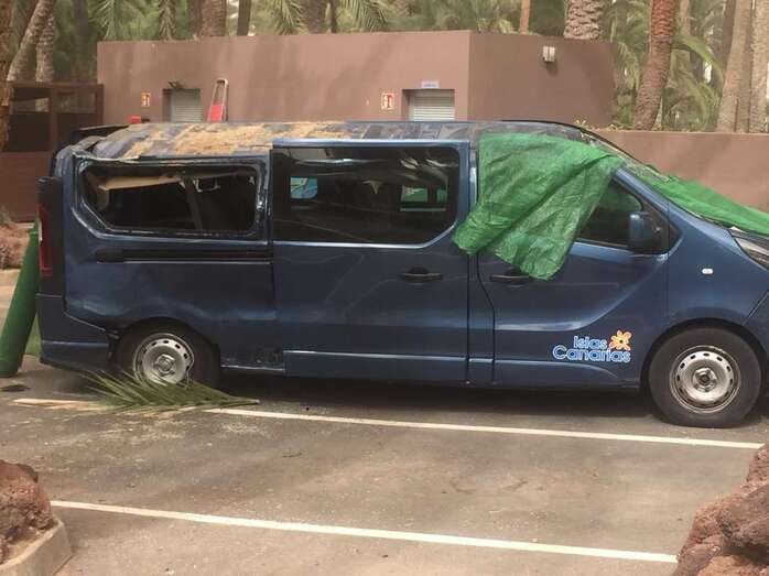 La caída del tronco de una palmera canaria en el Oasis de Maspalomas, debido a una racha de viento, provocó este domingo por la mañana cuantiosos daños a una furgoneta que estaba aparcada en el parquin privado de un conocido hotel de la zona.
