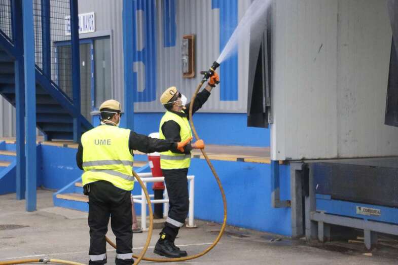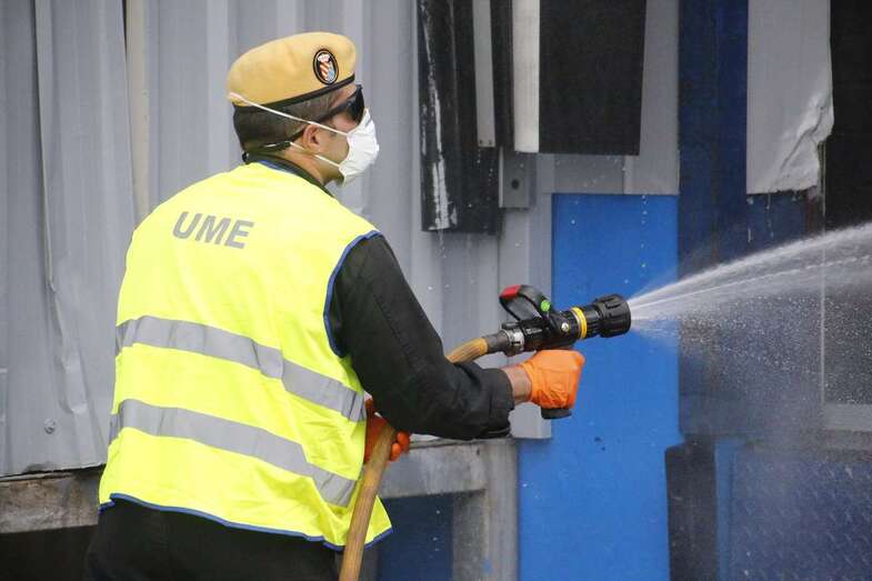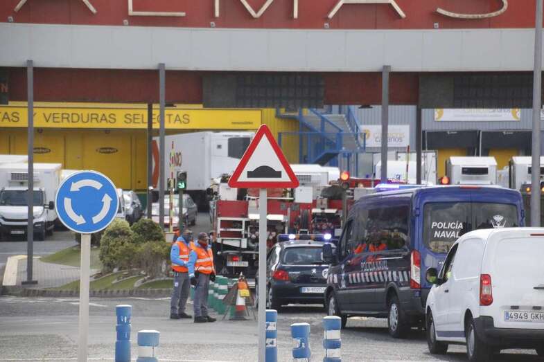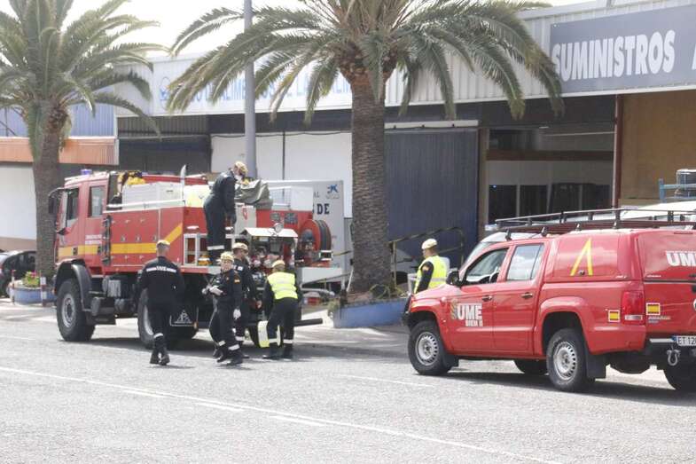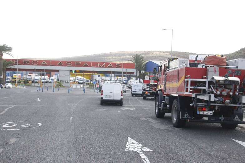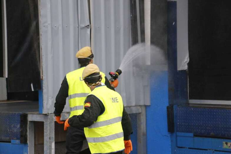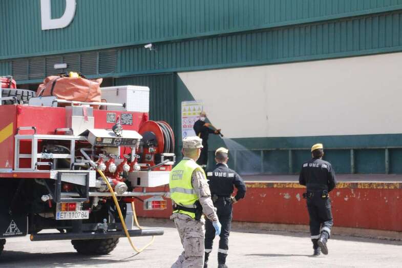 En su recorrido por Gran Canaria para intentar desinfectar del coronavirus los principales puntos de reunión de gente, como parques, el aeropuerto u otras zonas de mucho tránsito, la Unidad Militar de Emergencias estuvo trabajando en Mercalaspalmas.