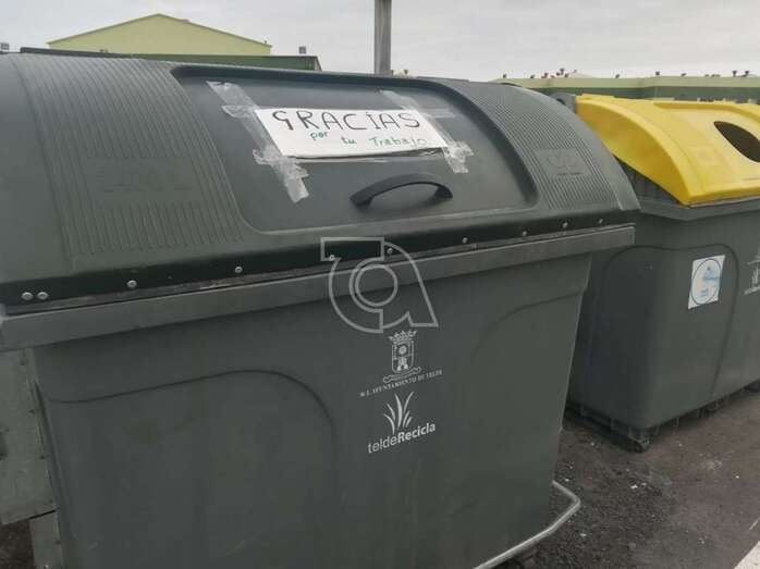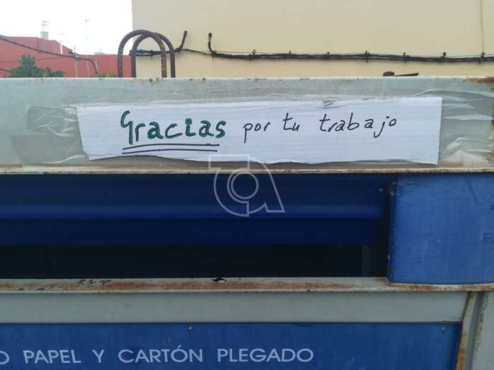 Marpequeña Alta ha colocado en los contenedores carteles de agradecimiento a la plantilla que presta el servicio de Recogida de Residuos Sólidos en la actual coyuntura de crisis sanitaria.