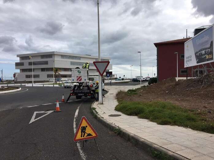 Operarios de Elecnor, empresa concesionaria del mantenimiento del alumbrado público en Telde, han reparado en las últimas horas las luminarias en mal estado de la rotonda de El Cubillo, en la circunvalación al casco urbano de la ciudad.