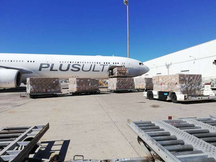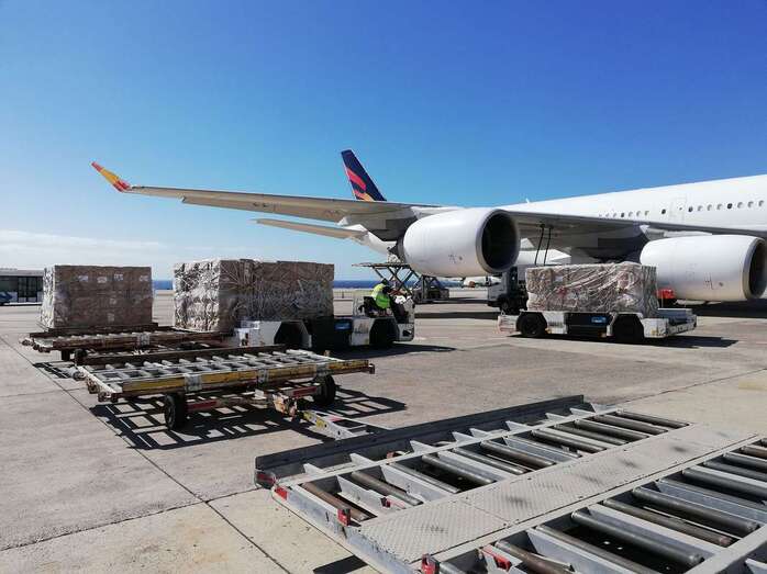 Descarga del avión con material sanitario en el Aeropuerto de Gran Canaria (Foto Acfi Press)