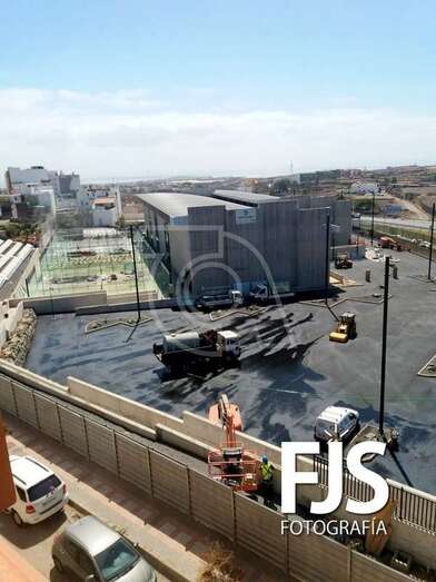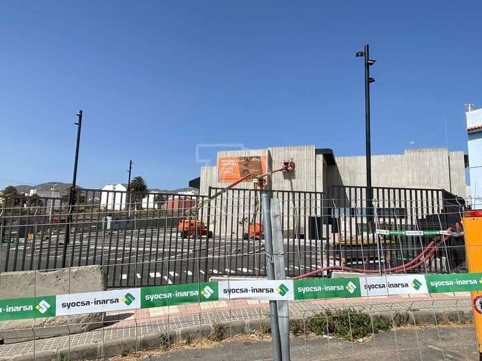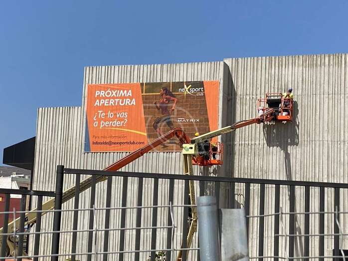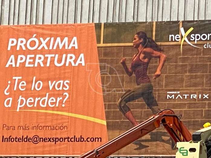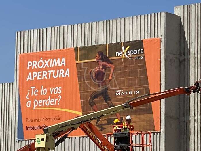 La empresa Syocsa-Inarsa que construye el nuevo complejo deportivo con piscinas en suelo público de La Barranquera anuncia su “próxima apertura” con un gran cartel colocada en la fachada del inmueble cuya construcción está pendiente únicamente de remates.