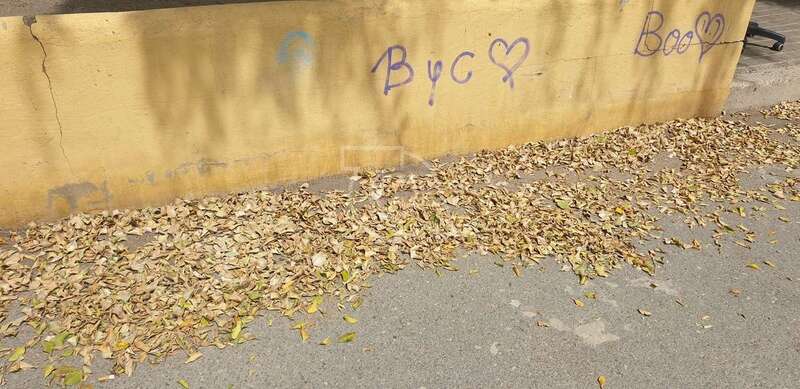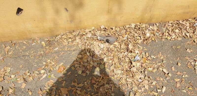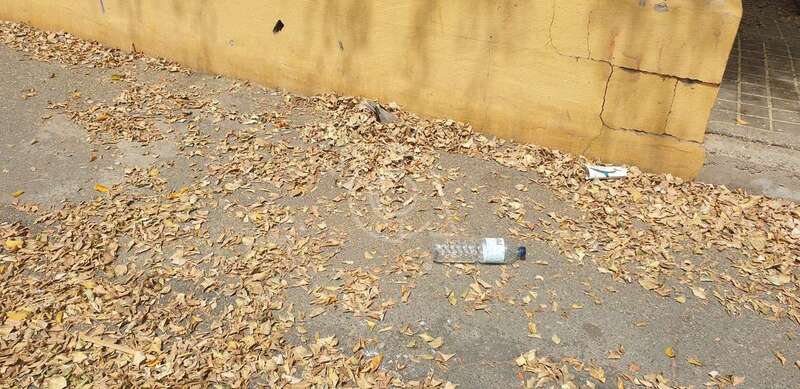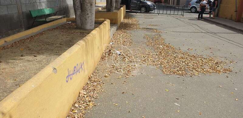 La calle de San Agustín, que pasa por delante de las instalaciones del CEIP Marpequeña, no puede estar más descuidada. Las hojas secas de la arboleda se acumulan en todos los rincones, así como bolsas de basura, envases de plástico, latas de bebidas y tórtolas muertas.
