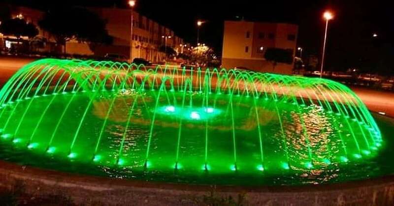 Parques y Jardines ha iluminado este fin de semana con color verde esperanza los chorros de agua de la fuente de la Plaza Anna y Vicente Ferrer, en la urbanización La Vega, para concienciar a la población en el Día Internacional contra el Cambio Climático.