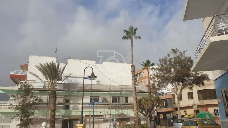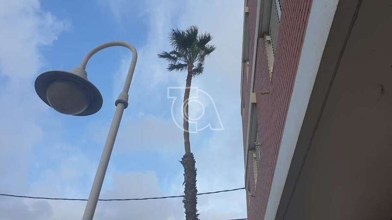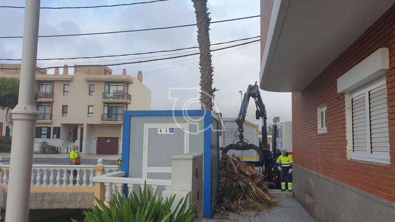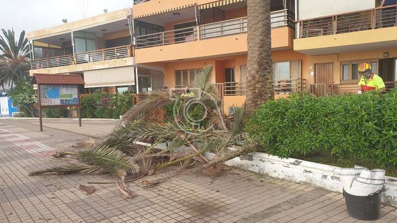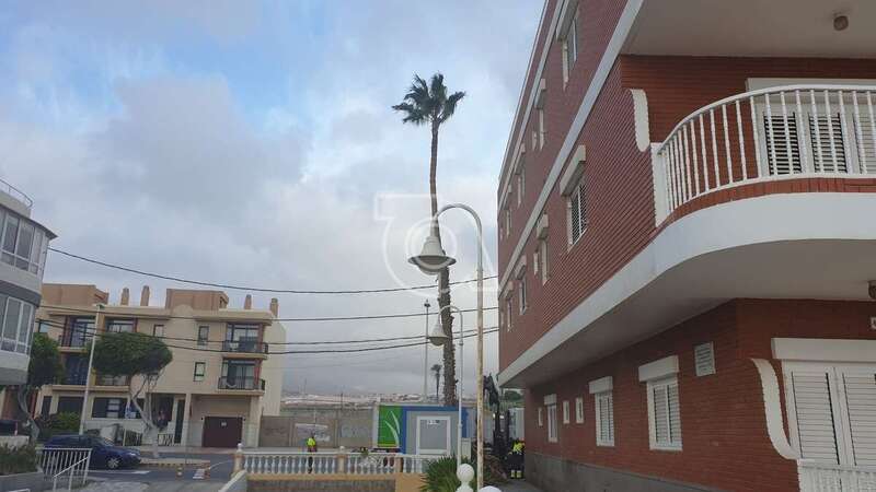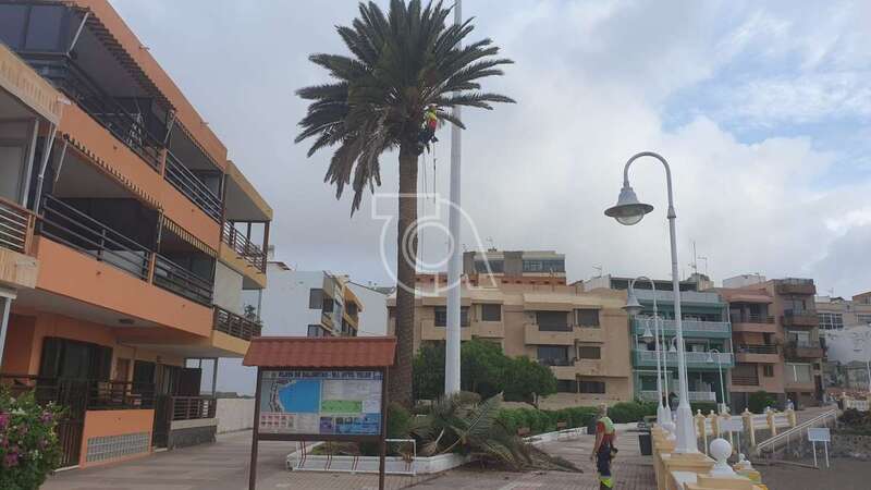 Imagen de la poda y limpieza de una palmera en un parterre de la avenida marítima de Salinetas, esta mañana/TA.