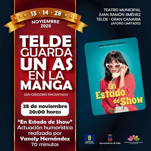 Durante 70 minutos, la actriz Yanely Hérnadez dejó a Telde en estado de show con un exitoso espectáculo, repleto de humor, que agradó al público que acudió al Teatro Municipal para ver en directo el evento de la campaña Telde guarda un As en la manga de la Concejalía de Desarrollo Local que tutela la edila Lidia Mejías. TA ofrece un amplio reportaje gráfico y video resumen.