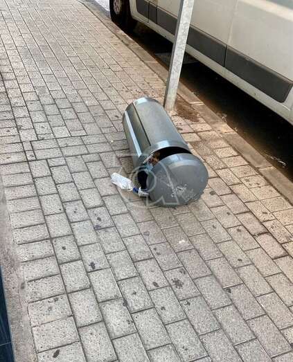 Imagen de la papelera tirada sobre la acera/TA. Imagen de la papelera tirada sobre la acera/TA.