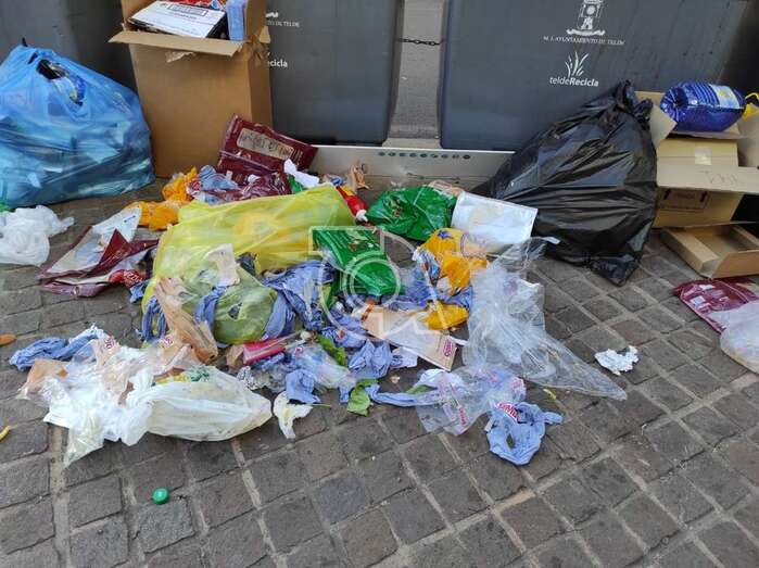 Los contenedores que están en la calle de Poeta Fernando González, en pleno centro de la ciudad de Telde, amanecieron este sábado rebosando de bolsas de basura y residuos que copan también el entorno más inmediato de los recipientes. La indignación vecinal por esta fea estampa es mayúscula.