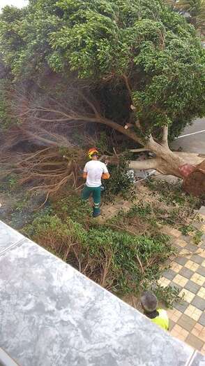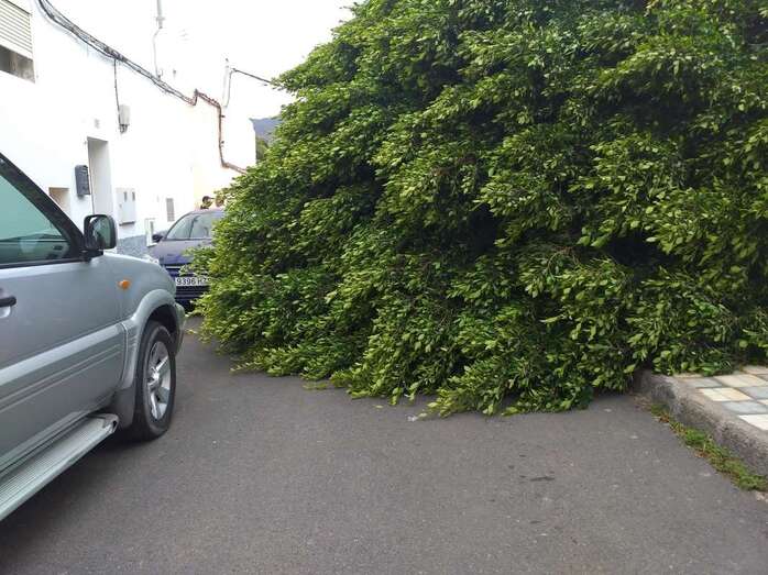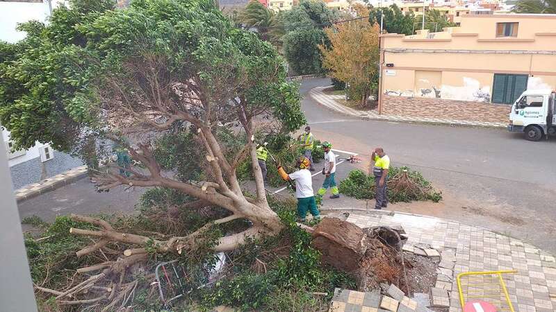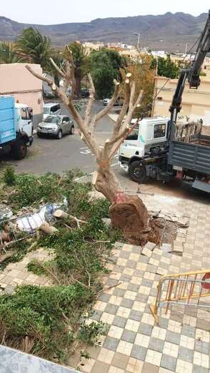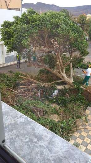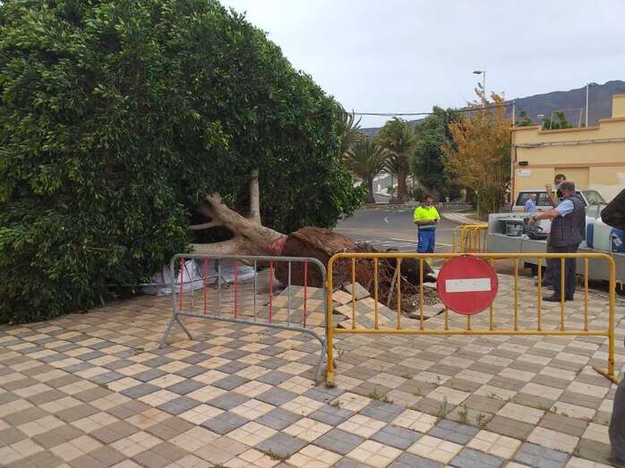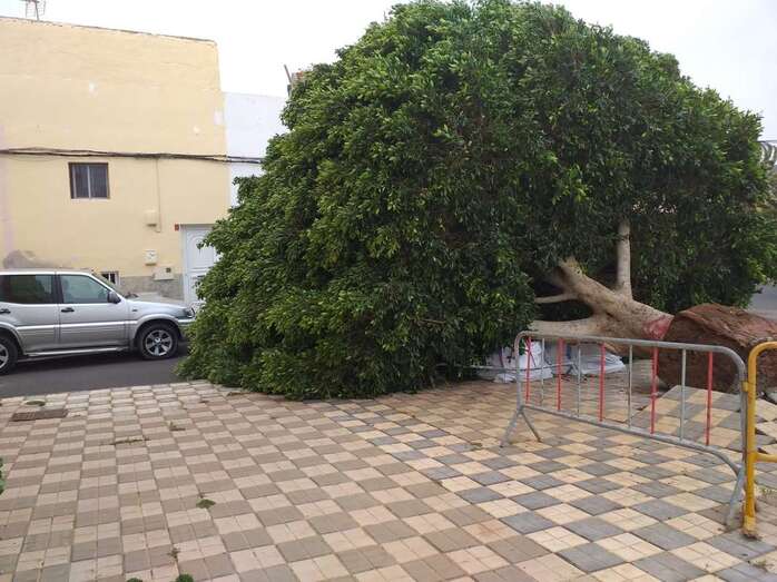 El viento derribó este martes un viejo laurel de Indias en un espacio público del barrio de Las Crucitas, en Agüimes. Operarios municipales cortaron las ramas y desmocharon el viejo ejemplar desplomado.