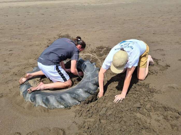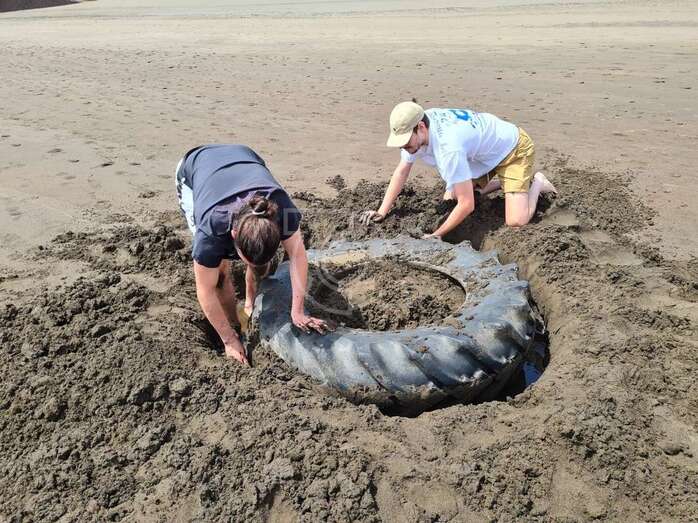 Dos jóvenes (Fran y Fernando) retiraron este martes una gran rueda neumática que el oleaje arrastró a la orilla por la playa del Hombre y que estaba semihundida en la arena.