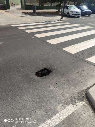Un agujero ha aparecido en la recién asfaltada calle de Manuel Alemán Álamo, en el Valle de Jinámar. El pavimento ha cedido dando pie a un agujero que se localiza a la altura del colegio Poeta Montiano Plaeceres.