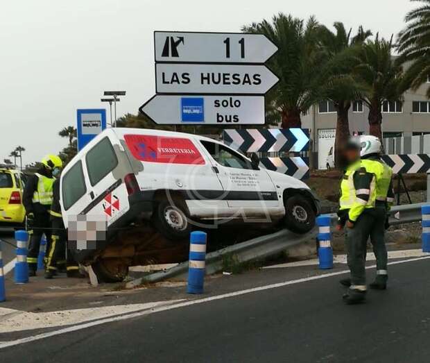 Una furgoneta semivolcó en el desvío desde la autovía GC-1 para acceder a Las Huesas. El vehículo quedó montado sobre los guardarraíles metálicos. El accidente ocurrió este domingo por la mañana e intervinieron agentes de la Guardia Civil de Tráfico y bomberos del parque zonal de Telde.