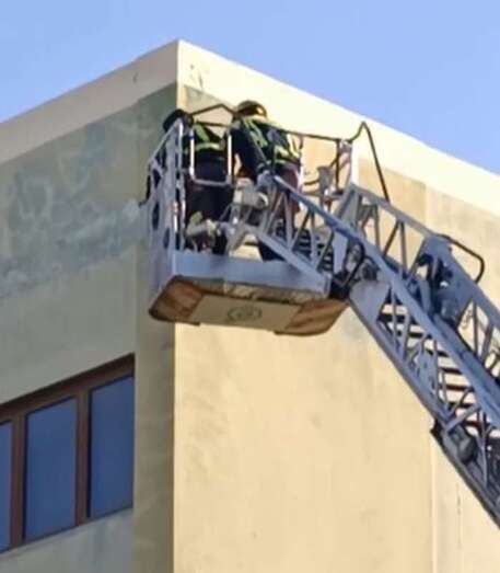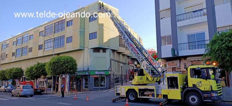 Bomberos del parque zonal de Telde fueron activados esta tarde ante la caída de cascotes del edificio que hace esquina entre las calles de Secretario Guedes Alemán y Poeta Pablo Neruda. El personal del Consorcio de Emergencias de Gran Canaria usó un camión grúa para acceder a la fachada del inmueble en mal estado.
