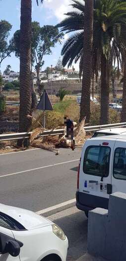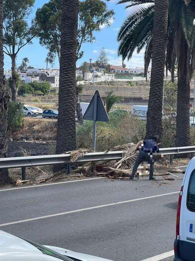 Un conductor retira las hojas de palmera caídas sobre la carretera de Jinámar / TA Un conductor retira las hojas de palmera caídas sobre la carretera de Jinámar / TA