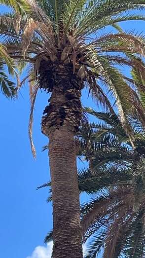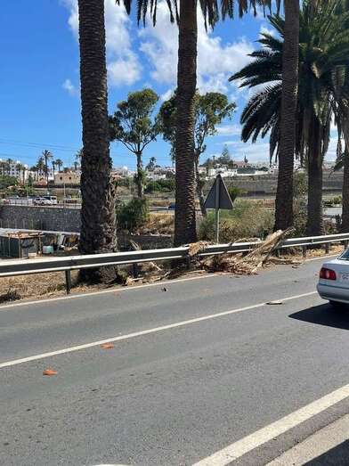 La falta de poda y cuidados que sufren las palmeras ubicadas en el Barranco Real de Telde junto a la carretera de Jinámar (GC-100) está provocando que las hojas caigan sobre la calzada y que los propios conductores tenga que pararse a retirarlas.