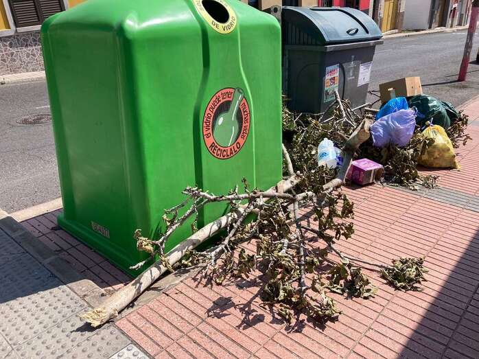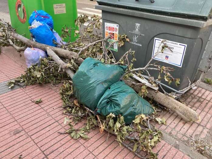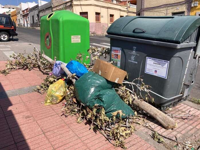 La vecina Paula Benítez León denuncia que otros residentes de la calle El Ejido podan sus fincas y depositan los restos vegetales junto a los conteendores de basura pero sobre la acera, dificultando el paso de los viandantes e impidiendo el acceso a los propios recipientes.