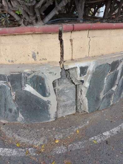 Las grietas han irrumpido en la plaza del barrio teldense de Lomo Bristol, resquebrajando muros y pavimento. Los vecinos advierten del peligro que puede suponer esta situación.