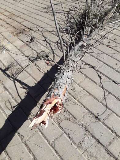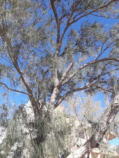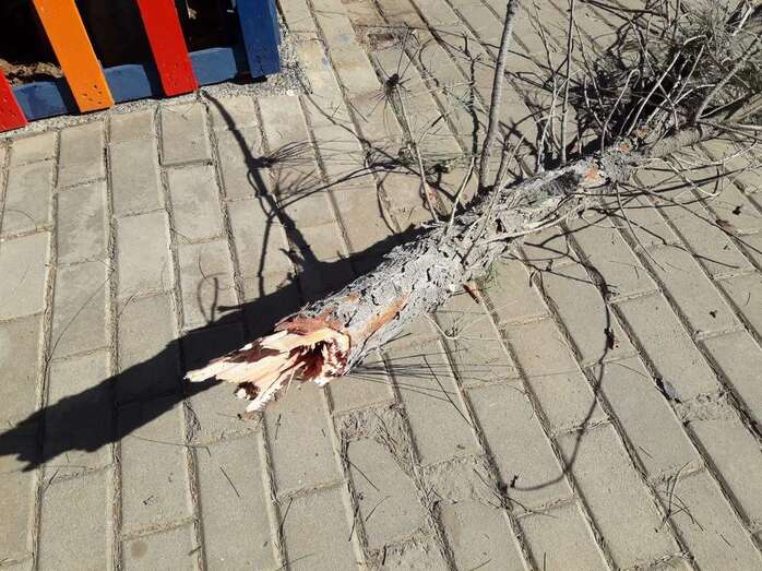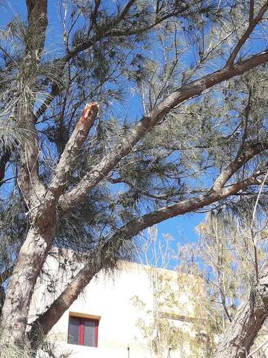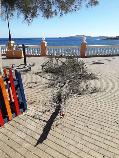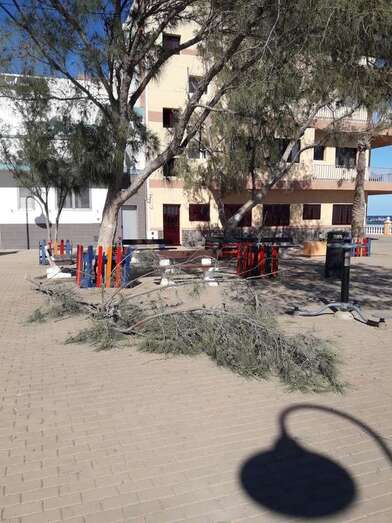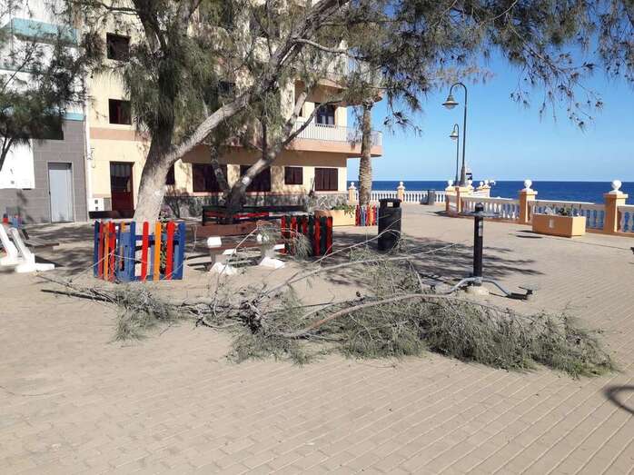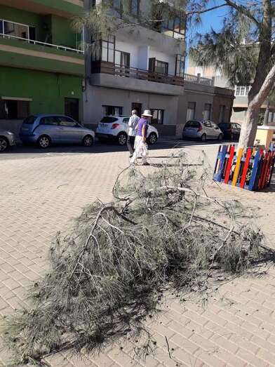 Una rama de un pino marino (Casuarina equisetifolia) y considerable tamaño cayó a primera hora de este viernes desde varios metros de altura sobre la denominada plaza de Los Pinos de Clavellinas. El suceso se produjo en una zona muy transitada de la costa de Telde, en pleno paseo marítimo y junto a unos bancos y aparatos biosaludables.