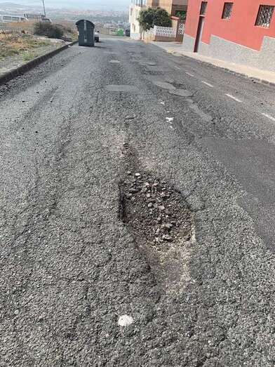 Un conductor denuncia que el mal estado que presenta el asfalto en la calle Miño, en la parte alta del barrio teldense de Caserones, le ha causado daños en su vehículo. Un bache provocó el pinchazo de dos de las ruedas del vehículo.